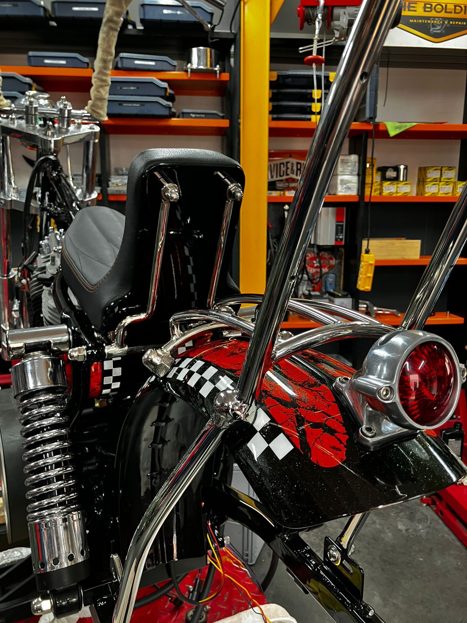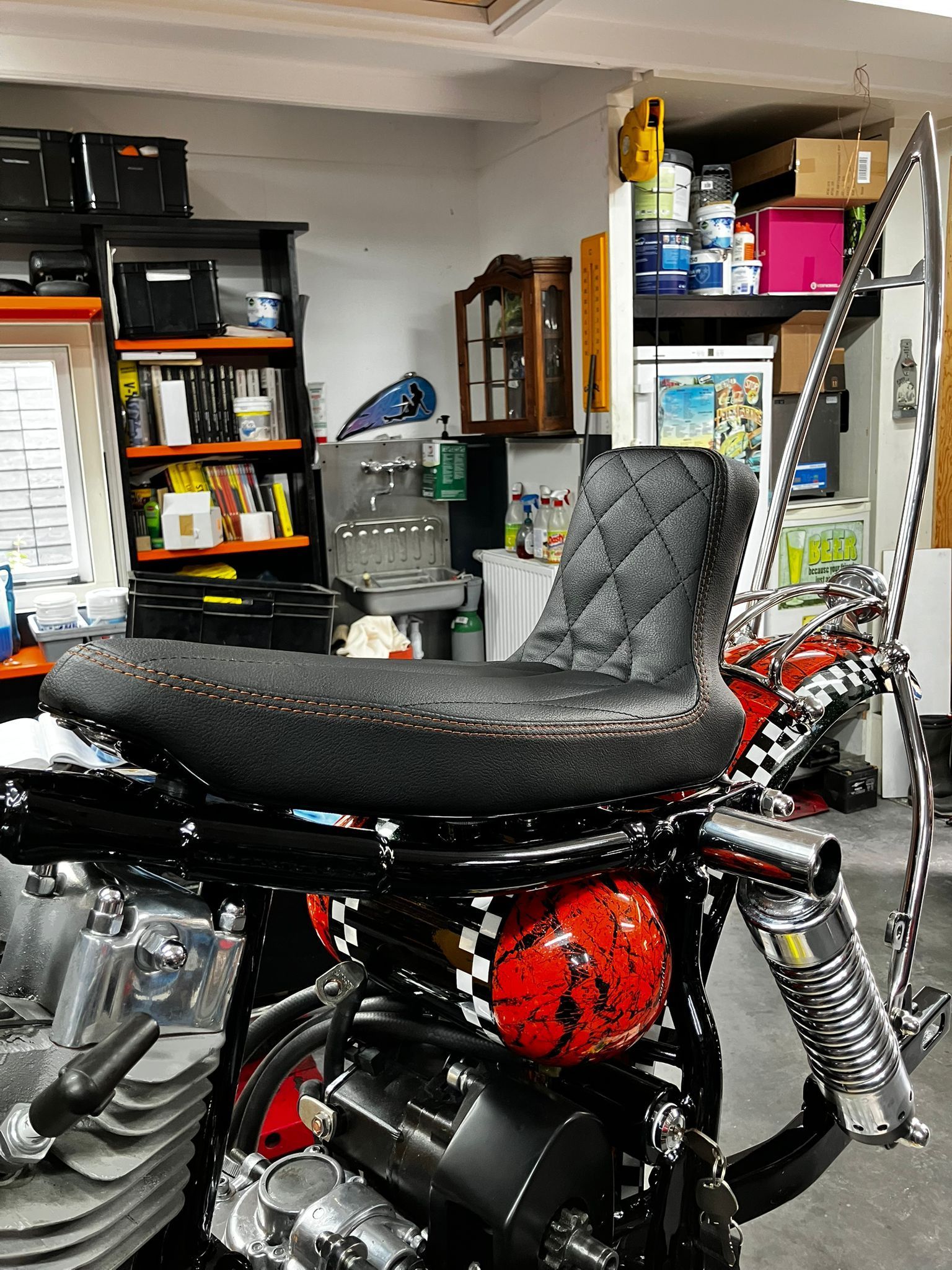 Open belt, zelfgebouwde sissy bar, eigen zadel. Alles in onze eigen Boldies-style.