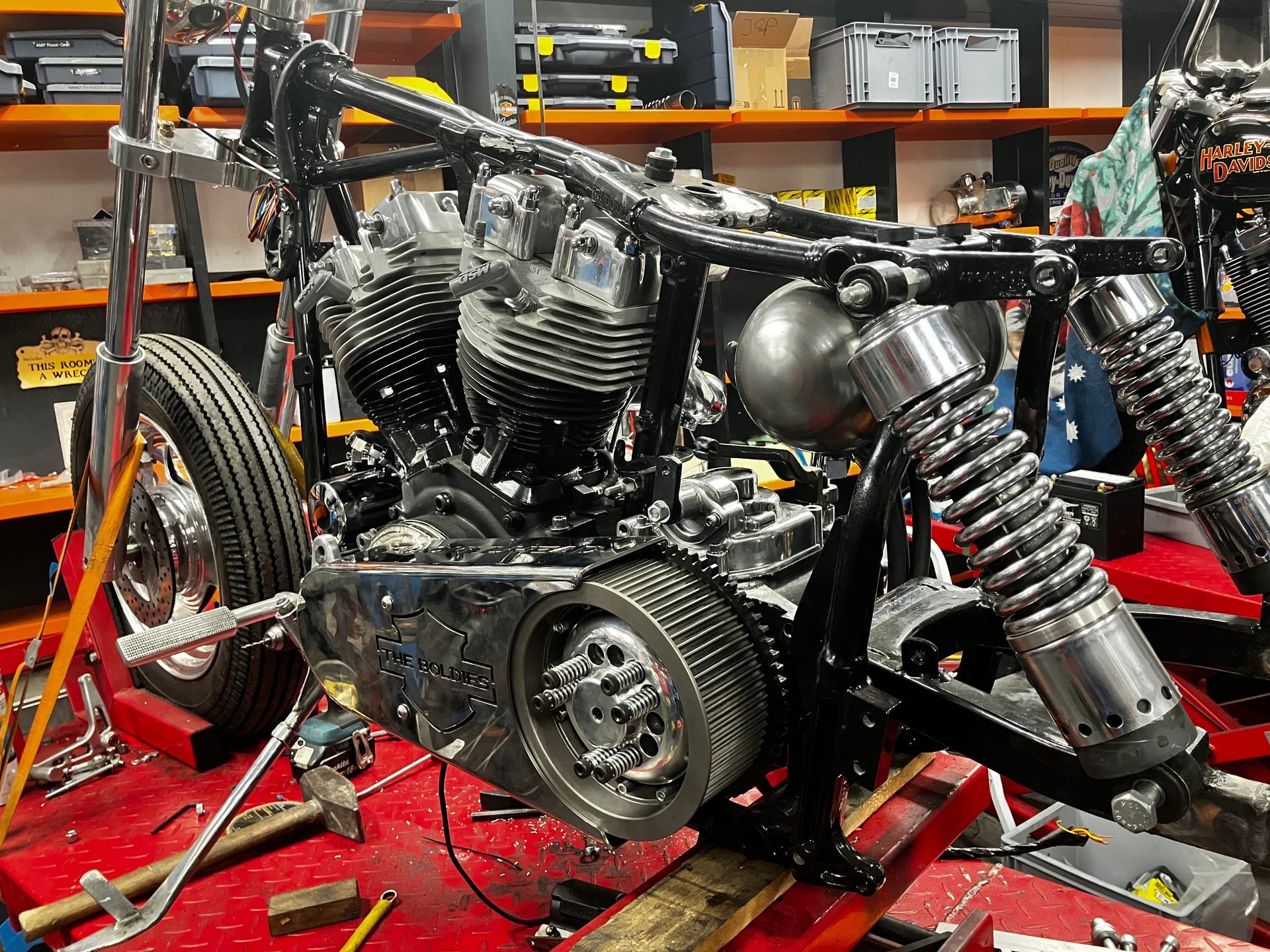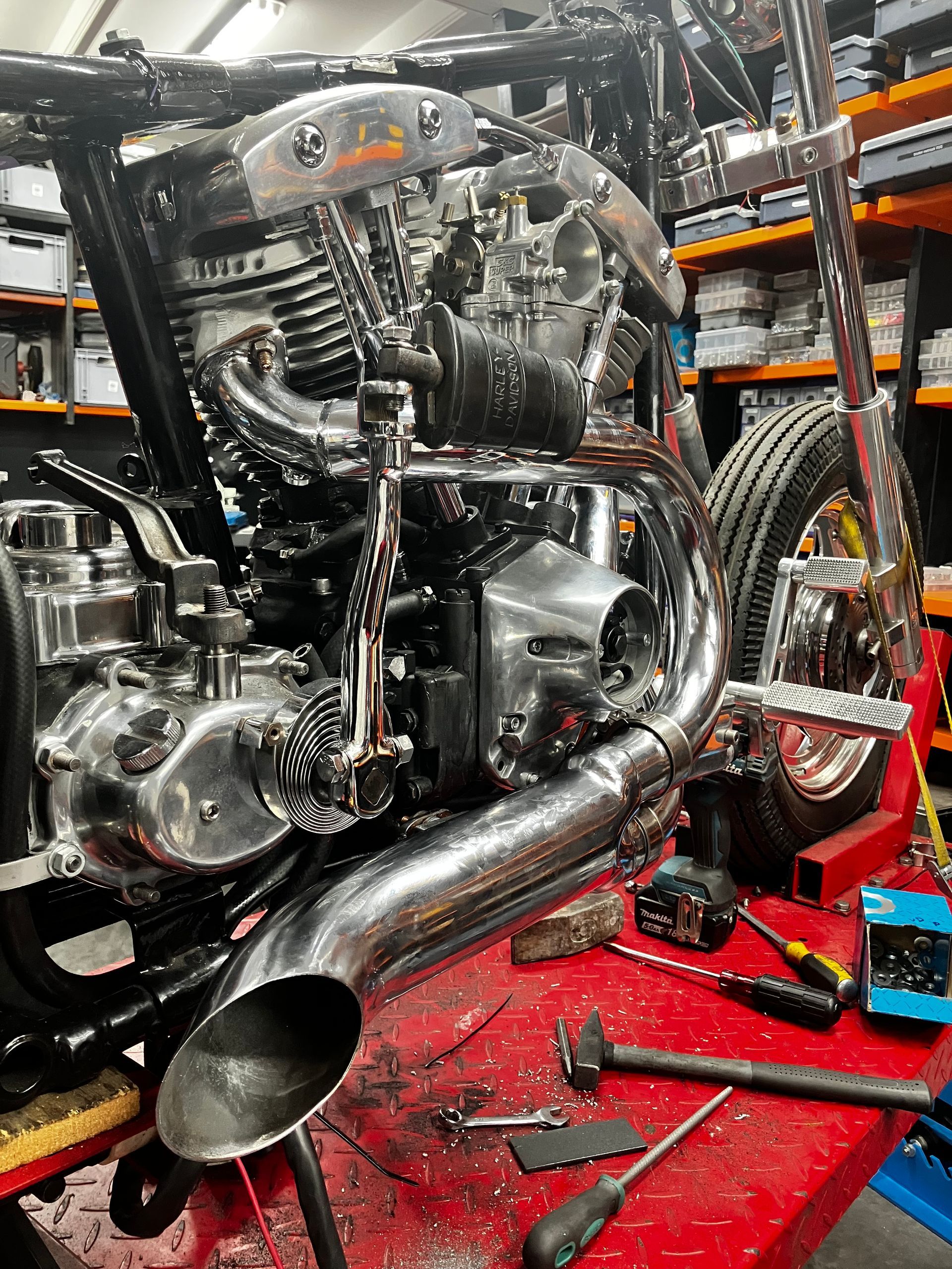 Een onafgerond bouwproject met onderdelen nog in kisten, bij elk vrije uurtje wat we samen hadden gingen we de schuur in om aan deze shovel te werken. Om uiteindelijk op de Big Twin te kunnen staan. We zijn nog niet helemaal klaar, maar blijf ons vooral volgen en over 5 weken het eind resultaat.