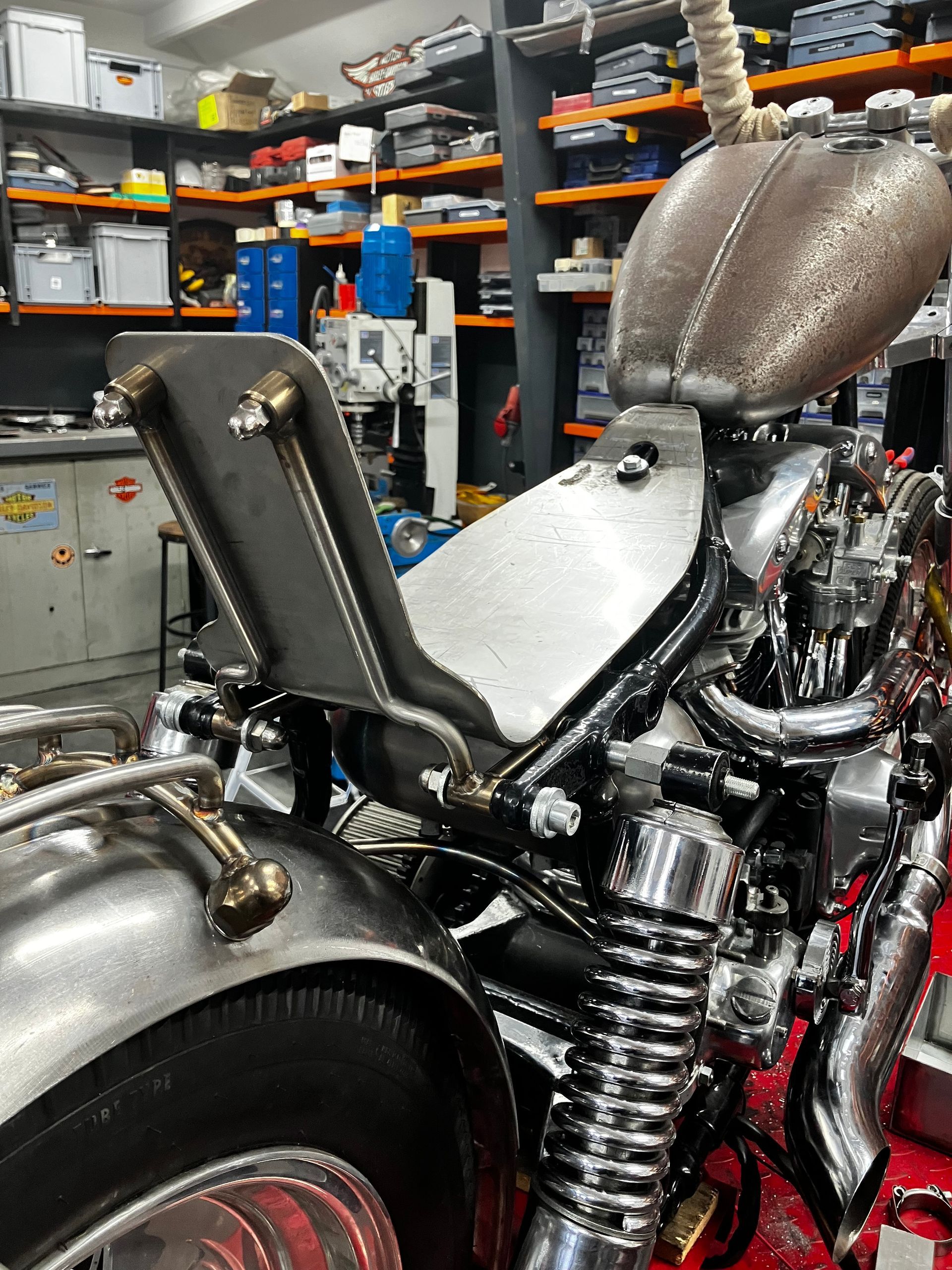 Met veel eigen ontwerpen en ideeen, hebben we de open belt kast gemaakt. Een boldies ontworpen sissy bar en een eigen ontwerp zadel. Limeted edision.